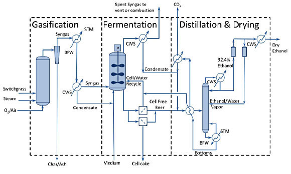 Ethanol is manufactured from syngas via either chemical or biological processes. For chemical synthesis, ethanol can be produced using catalyst-based processes that use methanol as the feedstock. In biological processes, several technology companies have developed patented bacteria that ingest the syngas and excrete a weak solution of ethanol. The ethanol is then concentrated via common distillation to fuel-grade concentration. Below is an example of a process to produce ethanol.