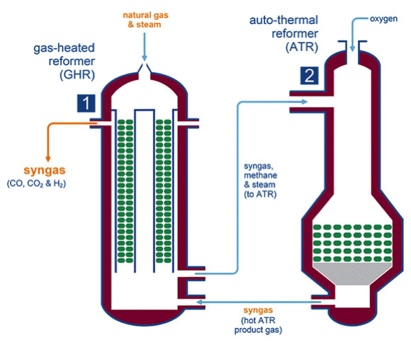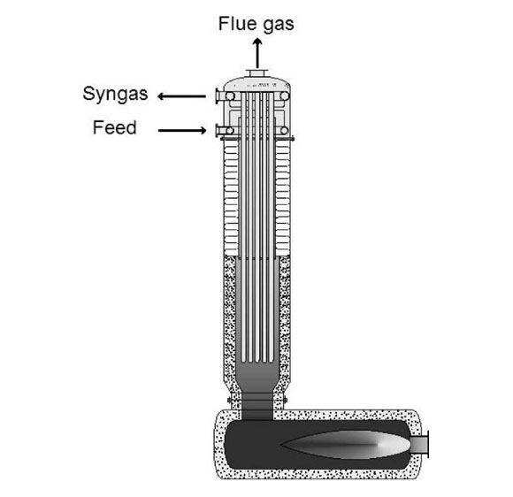 The gas-heated reformer (GHR) is a compact, refractory-lined vertical vessel containing vertically-supported tubes filled with catalyst. Counter-current heat exchange with a product syngas from an upstream reformer (SMR or ATR) provides the heat for the endothermic reforming reaction.